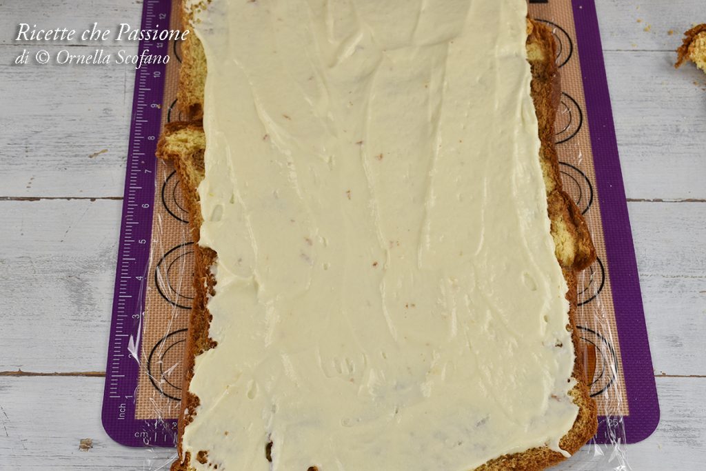 Bevochtig de hele pandoro met koffie. Vul met de mascarpone crème en verdeel over het hele oppervlak. Rol dan op vanaf de kortere zijde.
