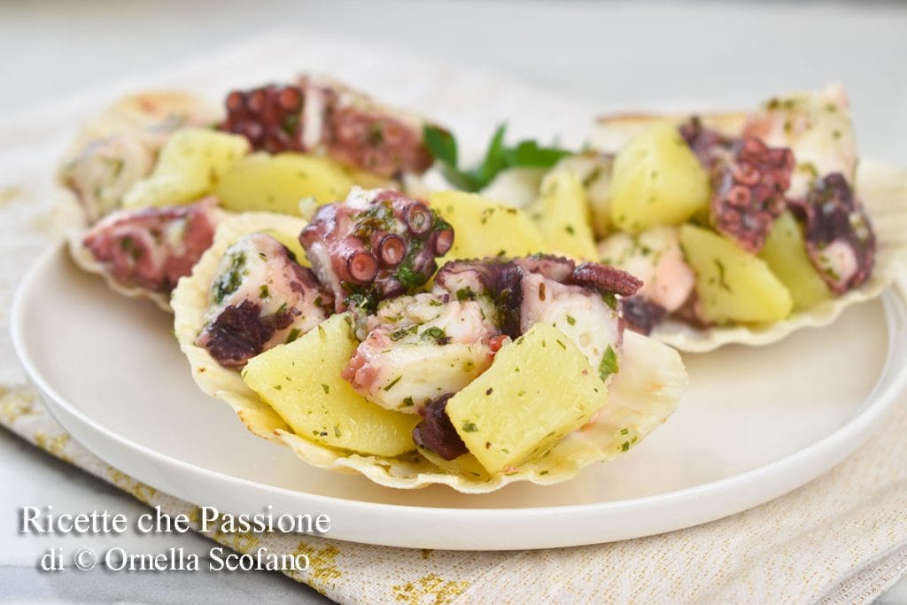 Octopussalade met aardappelen op schelpkap