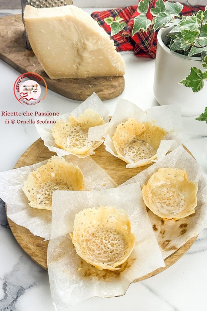 Parmezaanse mandjes voor heerlijke voorgerechten met Kerstmis en niet alleen, gemakkelijk te bereiden in een paar minuten en je hebt maar één ingrediënt nodig, probeer te raden welk 🙂 . Voor het recept heb ik een mooi stuk Parmezaan gebruikt dat ik thuis met een gewone rasp heb geraspt, het duurt ongeveer een minuut om de benodigde kaas te raspen, iets meer dan 100 g voor 5 mandjes. Ik raad aan om versgeraspte Parmezaan te gebruiken omdat het een geweldige smaak heeft, dezelfde smaak die je in het mandje zult vinden, geweldig. We kunnen de parmezaanse mandjes op vele verschillende manieren vullen, met vleeswaren, olijven en kazen, of met een garnalencocktail, en ook nog russische salade, of met een zachte room van ricotta en gerookte zalm.