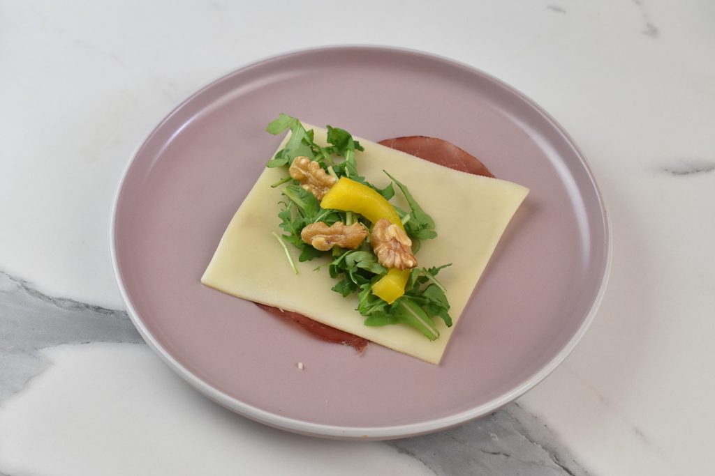 Op een bord leggen we een plak bresaola, we plaatsen er een plak kaas op en in het midden leggen we een beetje rucola, met een paar reepjes paprika en twee stukjes walnoot.