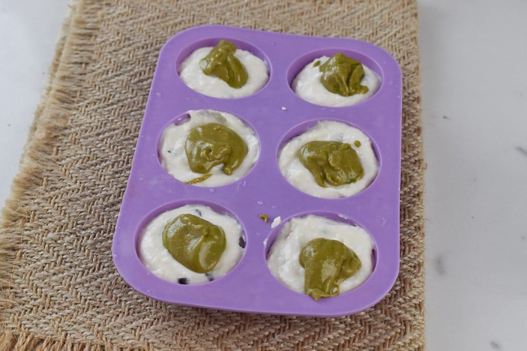 We vullen de siliconenvorm, die je kunt vinden door op de link te klikken, met 6 halve bollen ricottacrème, zoals ook te zien is in de video. Dan voegen we op elke halve bol een klein theelepeltje pistachecrème toe.