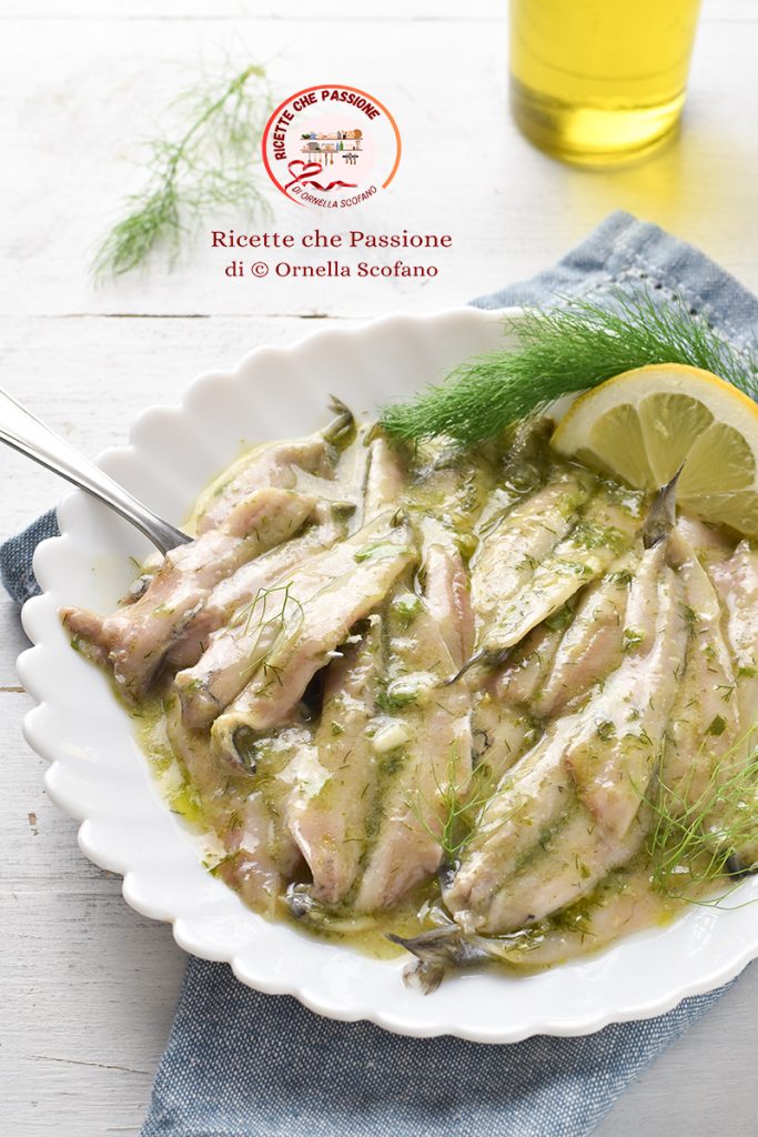 • Na 3 uur gieten we de ansjovis af. En bereiden we ons voor om ze te kruiden. We kunnen gehakte peterselie en knoflook gebruiken, met olijfolie en peperoncino, en een beetje zout. Ik heb ervoor gekozen om een sausje te maken door in de hakmolen, olijfolie met peterselie, knoflook, peperoncino, zout, een beetje zachte wilde venkel, en nog wat azijn en citroen te mengen. Nadat alles is gemengd, heb ik de saus gebruikt om de gemarineerde ansjovis te kruiden, anders dan gewoonlijk, echt heerlijk en met een frisse smaak. In plaats van wilde venkel kan ook munt worden gebruikt. Nu zijn onze gemarineerde ansjovis klaar om van te genieten, perfect om als voorgerecht te serveren of om onze salades te verrijken.