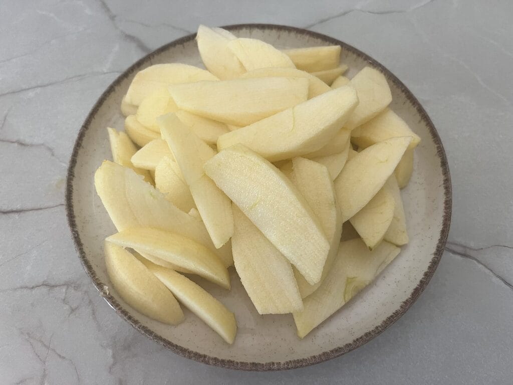 en, snijd apart twee appels in partjes (deze zijn voor de decoratie)