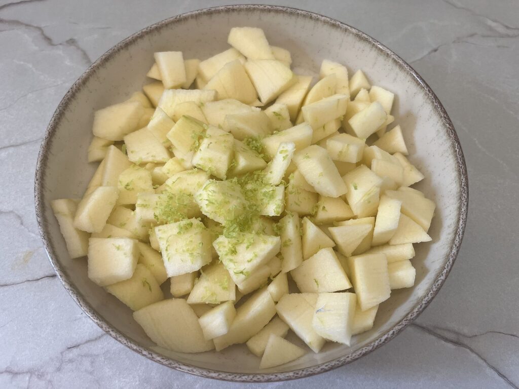 Snijd op een snijplank twee appels in blokjes en voeg de geraspte schil van een citroen toe