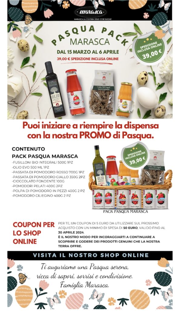 Met het Marasca Agricola bedrijf kun je profiteren van de super paasaanbieding, zie foto. Ga direct naar de winkel door hier te klikken AANBIEDING. Wie het Paaspakket koopt, krijgt een kortingsbon van 5 euro voor de volgende aankoop, geweldig toch?!