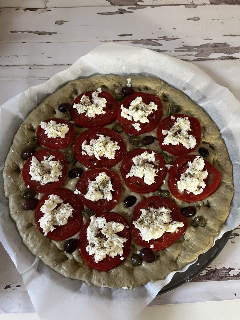 • En laten we het opnieuw ongeveer twee uur rijzen, altijd bedekt met een droge theedoek. Ondertussen snijden we de tomaten in plakken en de mozzarella in stukken. Vervolgens smeren we het oppervlak van de focaccia in met extra vierge olijfolie en plaatsen we de tomatenplakken, de taggiasca olijven, de kappertjes