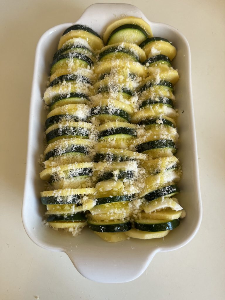 • Vervolgens oliën we een ovenschaal 22×15 en leggen we de lagen, eerst de courgette, dan de aardappel en als laatste de provolone tot voltooiing, zoals op de foto.