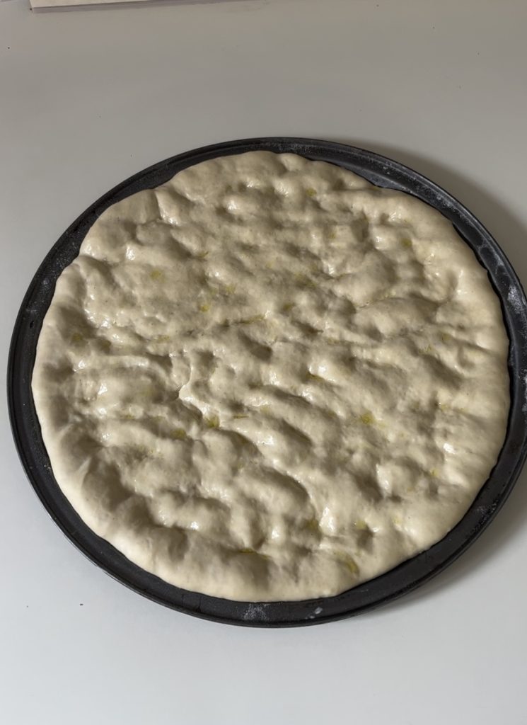Plaats vervolgens de deegbal opnieuw in de kom, bedek deze met een doek en laat het rijzen van 6 uur tot 24 uur. Als de rijstijd langer is dan 8 uur, moet het deeg in de koelkast worden geplaatst en minstens twee uur voordat het wordt uitgerold, eruit worden gehaald. Na de rijstijd bestuiven we een bakplaat van Ø33 cm en rollen we onze focaccia uit met de vingertoppen.