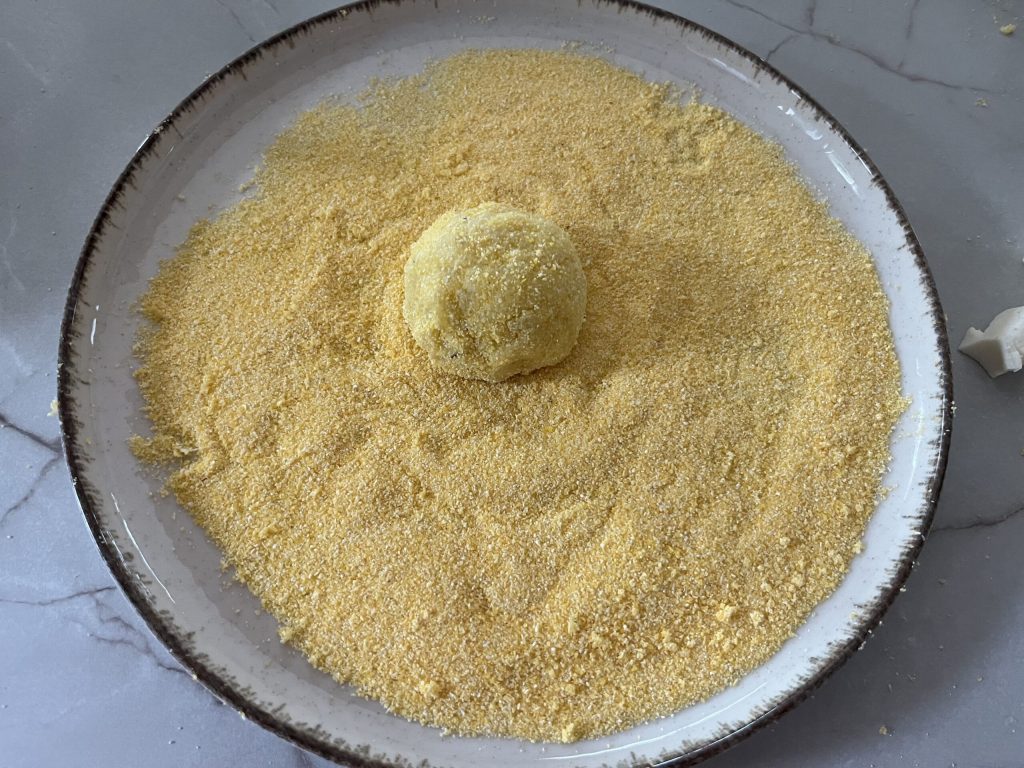 • Neem een portie van het mengsel, ongeveer een ruime eetlepel, plaats in het midden een stuk brie of scamorza, en sluit het af door een gehaktbal te vormen.