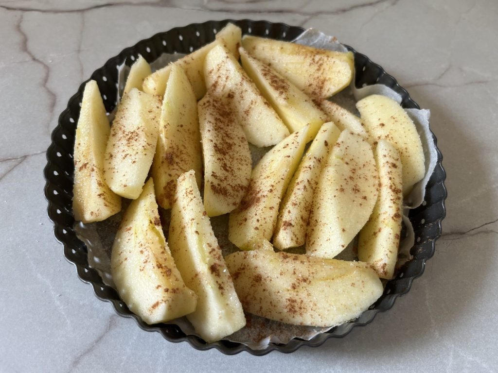 Leg ze op een bakplaat voor airfryer bekleed met bakpapier en bestrooi met kaneel