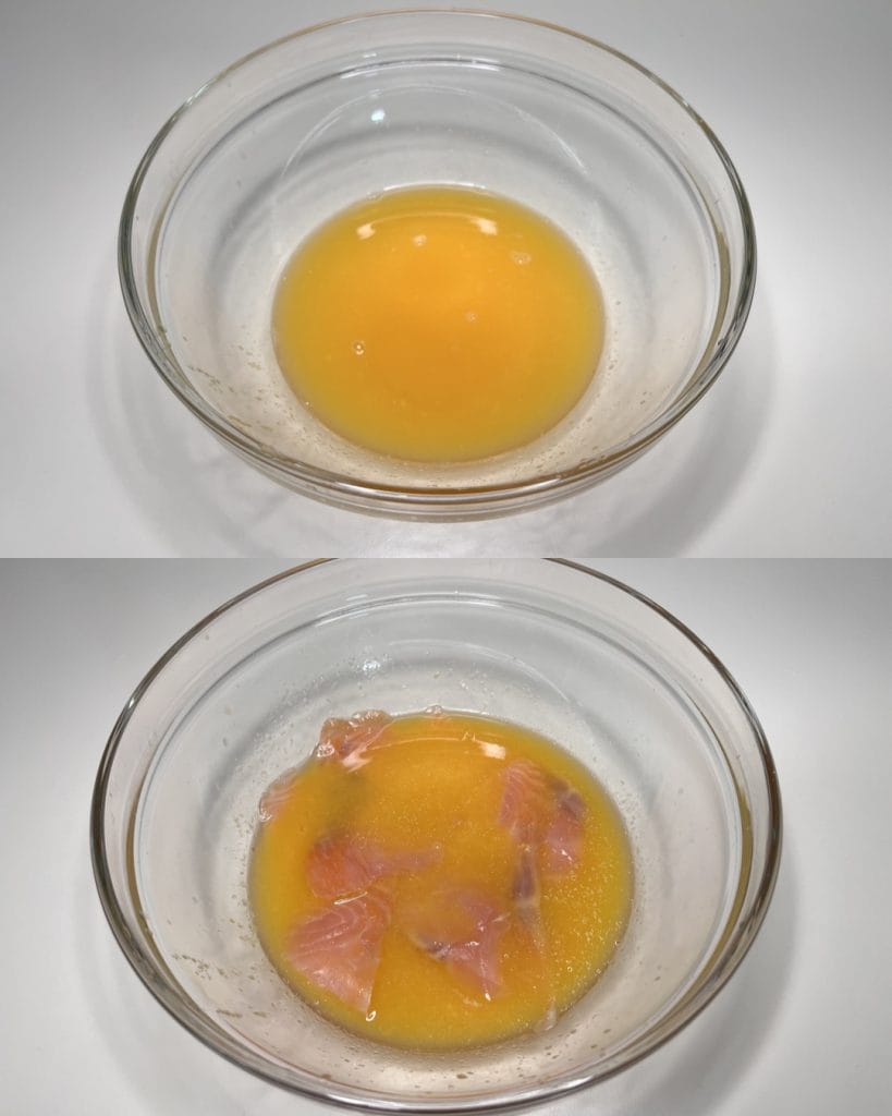 Snijd de zalm in plakjes en leg deze in de marinade van het citrusvruchtensap