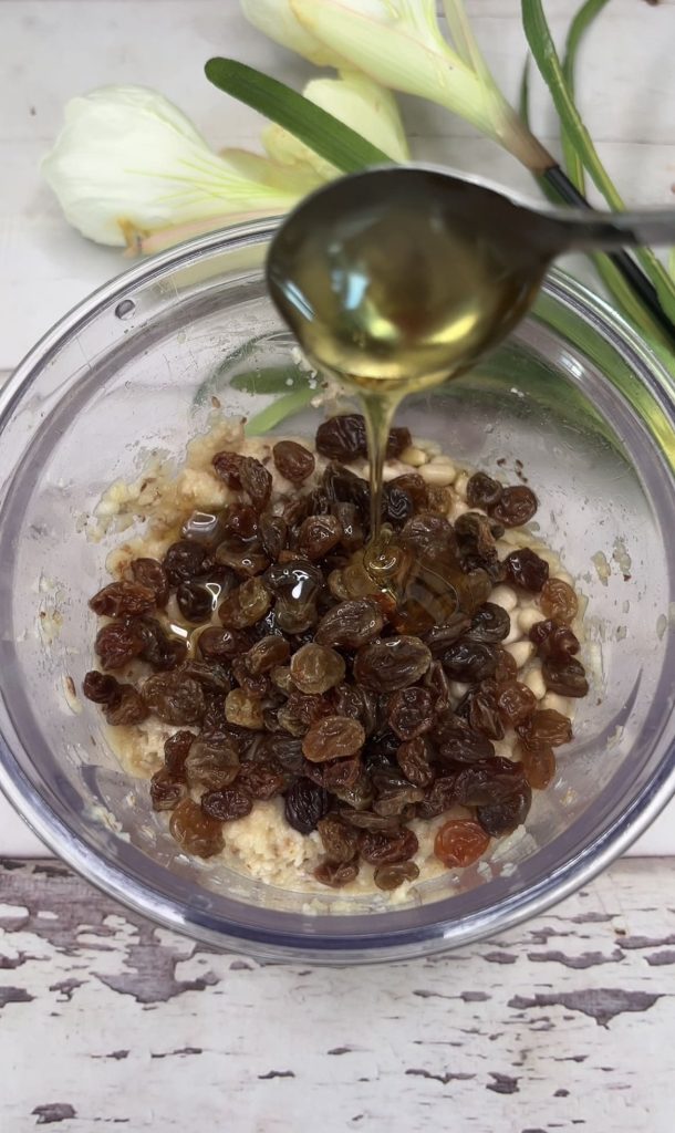 Week de sultana rozijnen in heet water, ongeveer twintig minuten, zodat ze opzwellen