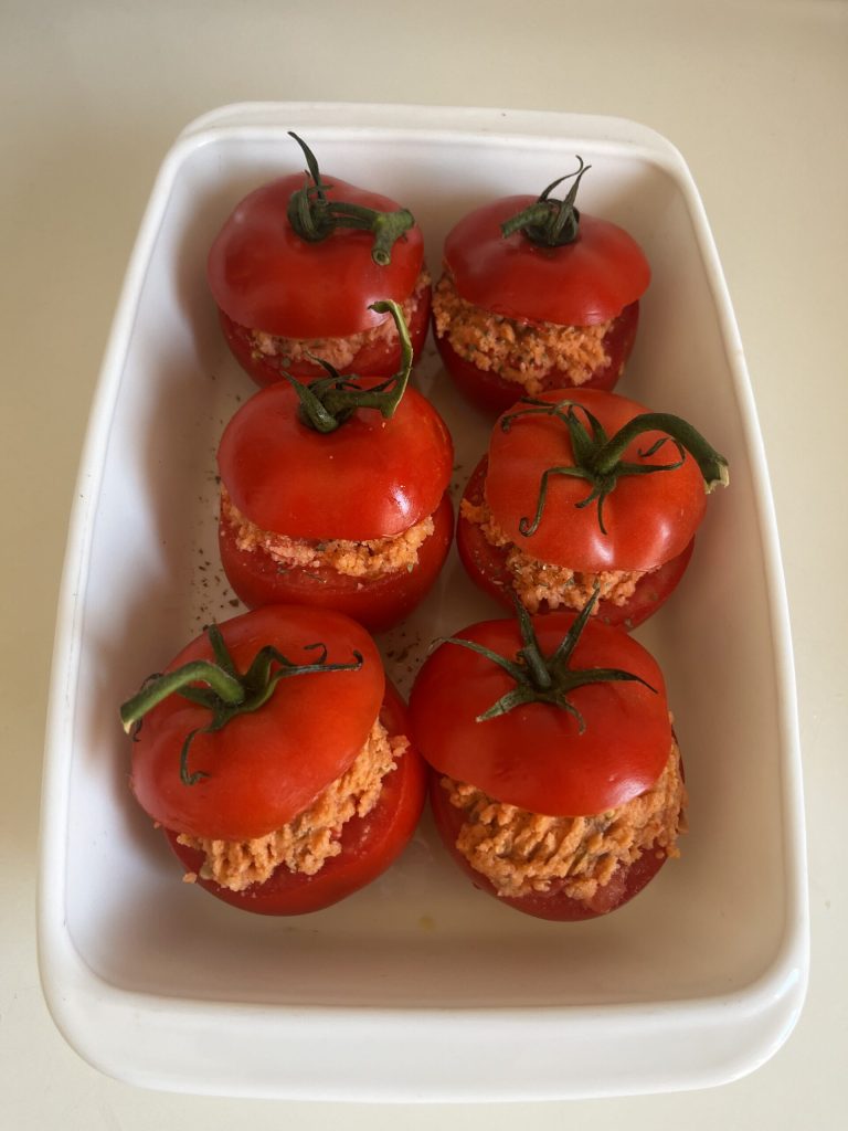 • Op dit punt is onze vulling klaar om de tomaten te vullen. Wees royaal met de vulling, laat deze goed over de rand komen. Voeg een snufje oregano toe en leg ze op een bakplaat die eerder is geolied.