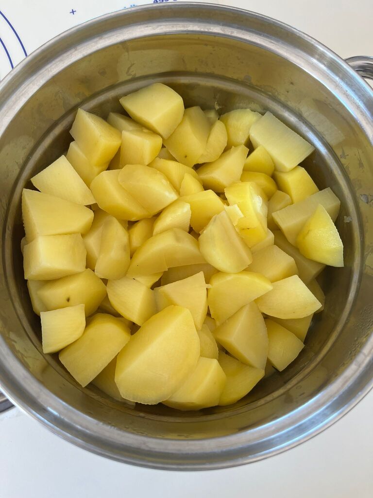 We beginnen met het schillen en pellen van de aardappelen. Snijd ze vervolgens in stukjes en plaats ze in een stoompan. Voor degenen die er geen hebben, kunnen ze gemakkelijk in een gewone pan koken met veel water, maar heel en met de schil, om ze vervolgens, als ze koud zijn, te schillen.