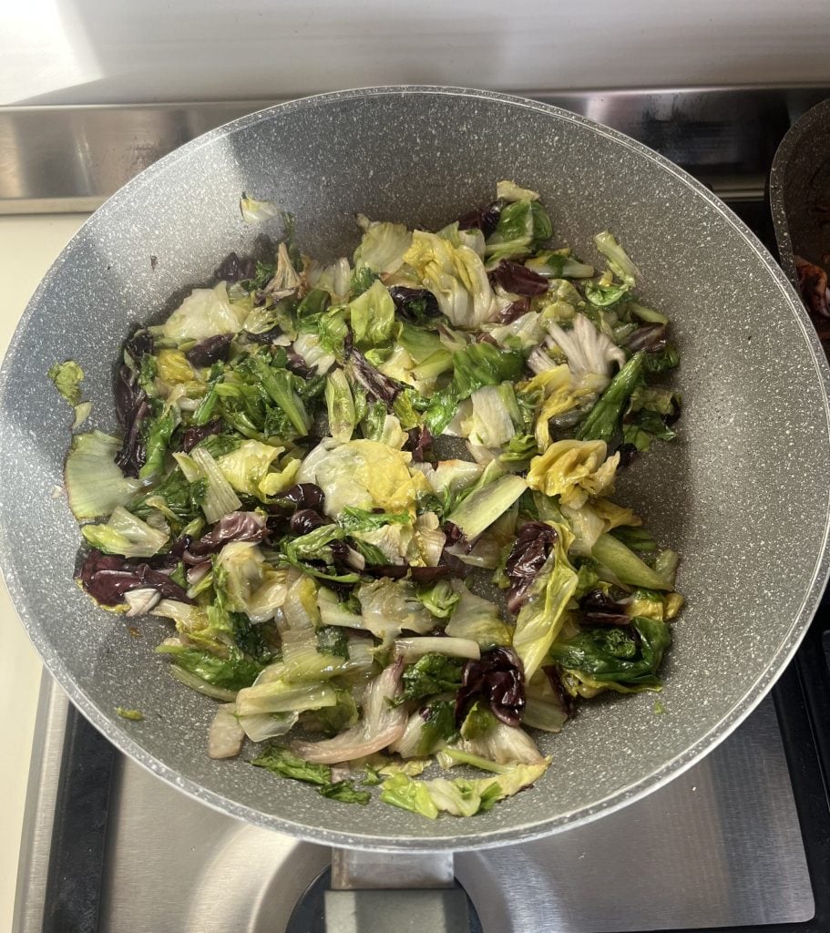 Intussen voegen we in een antiaanbak pan een halve vinger extra vergine olijfolie en vier geplette teentjes knoflook toe met de meskant van een mes, zodat de schil van de pulp loskomt en laten we het fruiten. Verwijder ze als ze gefruit zijn en voeg de salade, het zout toe en laat ongeveer tien minuten koken, af en toe roeren met een houten spatel en met de deksel erop.