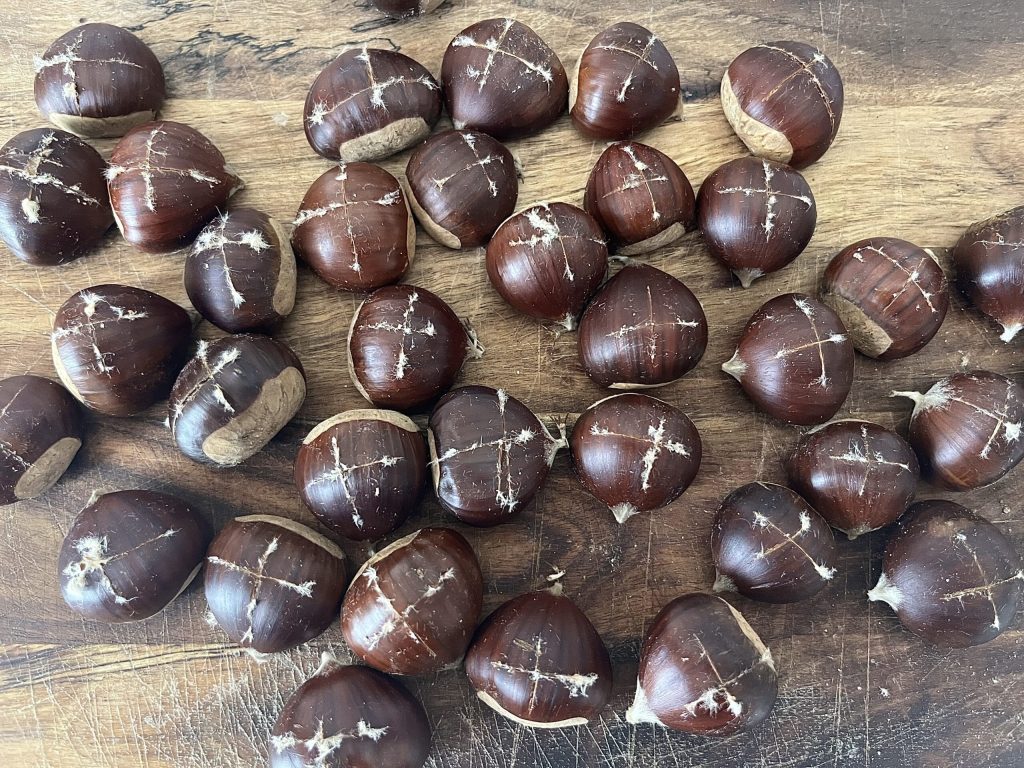 Op een snijplank, snijd je met een mes een kruis in de bolle kant van de kastanjes zodat ze tijdens het koken openen. Snijd ook het vliesje onder de schil door, maar niet het vruchtvlees