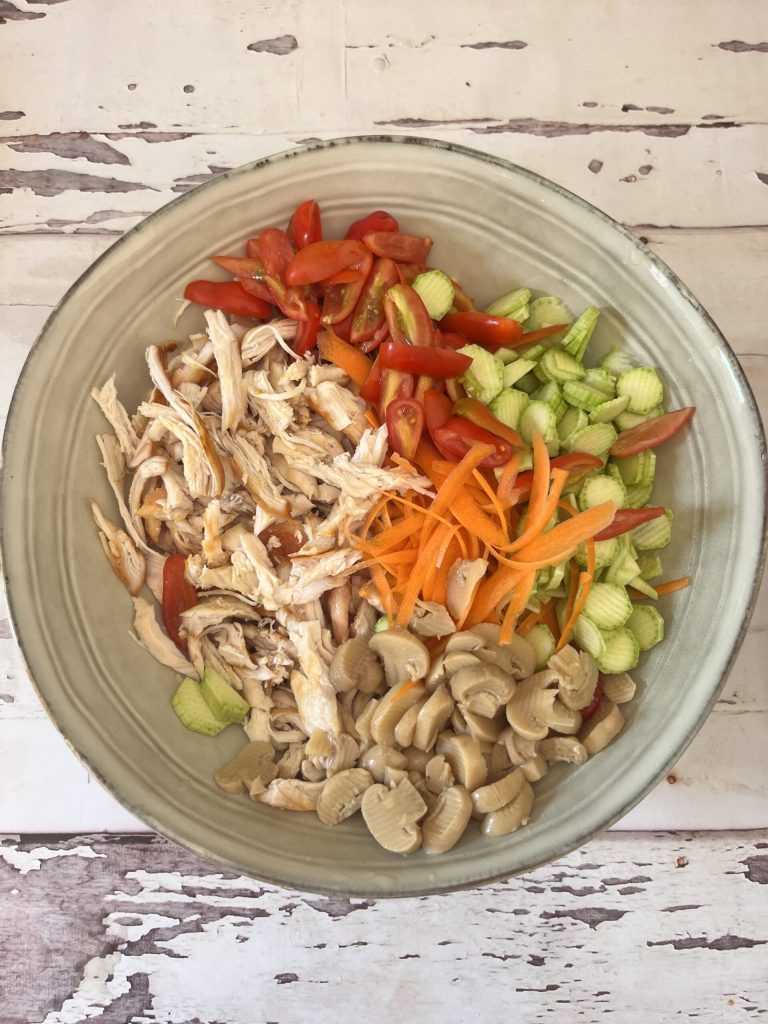 Deze salade biedt een ideale balans tussen eiwitten, vitamines en vezels. Kip zorgt voor een magere bron van eiwitten, essentieel voor het behoud van spiermassa en het bevorderen van verzadiging, terwijl groenten zoals tomaten, wortelen, courgettes en champignons een rijke verscheidenheid aan vitamines en antioxidanten bieden.
