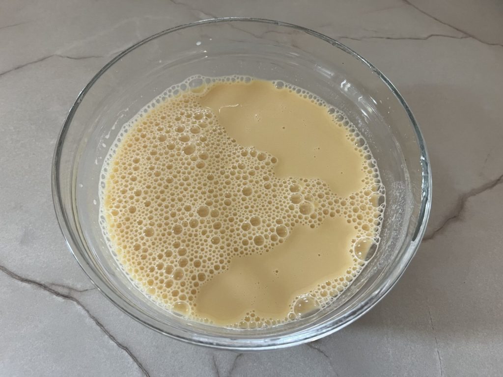 • In een kom giet je het kikkererwtenmeel, het water en het zout en met een handgarde, klop je krachtig tot je een homogeen mengsel krijgt. Laat minstens twee uur rusten, af en toe roeren, zodat het meel niet op de bodem zakt. Hoe langer het rust, hoe beter.