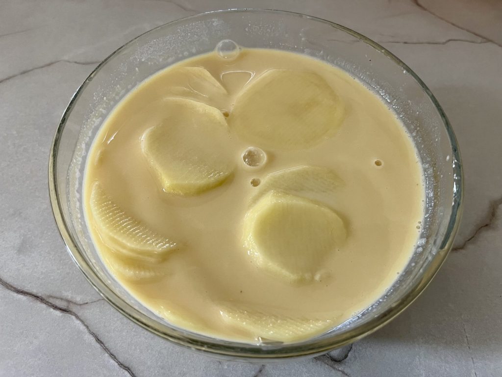 • Om de heerlijke knapperige aardappelkoek te maken, begin je met het schillen van de aardappelen met een dunschiller en snijd ze fijn met een mandoline