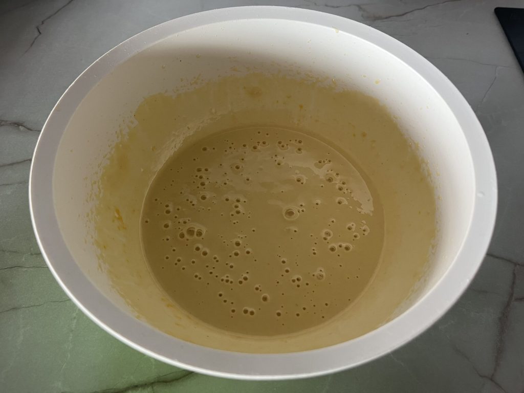 Voeg de geraspte schil van één citroen, de melk en de bloem toe, terwijl je blijft mixen met de garde.