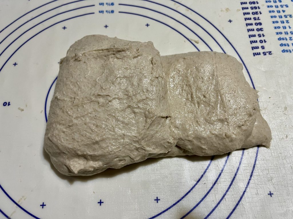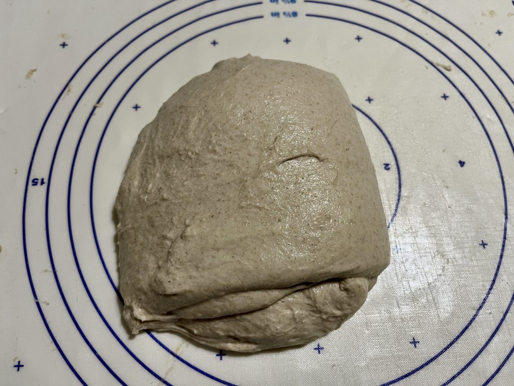 vouw dan de bovenkant eroverheen. Nu is het deeg op zichzelf gesloten. Laat het deeg opnieuw 20 minuten rusten en herhaal de handeling nog twee keer, telkens met 20 minuten tussenpozen. Verplaats het dan naar de koelkast op 4 °C voor 24-48 uur.