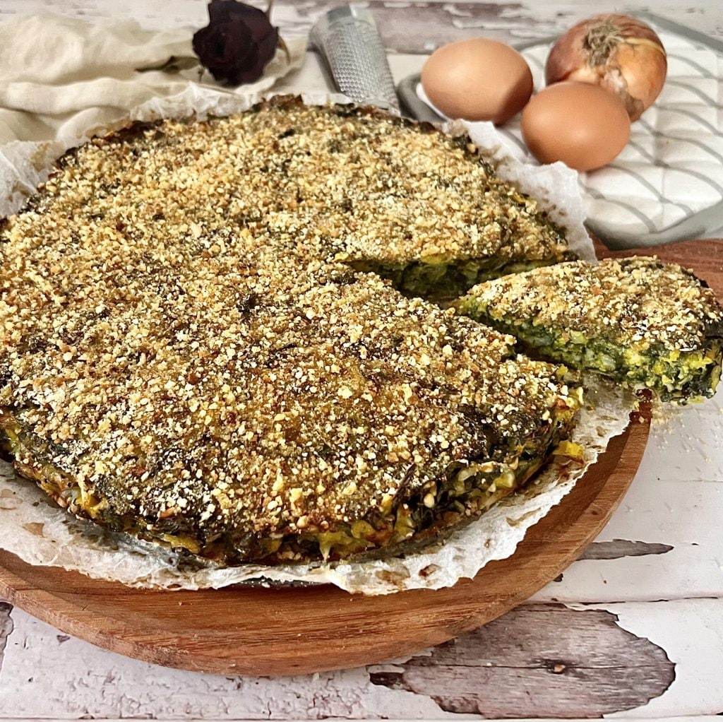 De pompoen en snijbiet taart zonder bladerdeeg is een hartige taart van snijbiet, pompoen en rijst bedekt met een knapperig laagje paneermeel dat het bladerdeeg vervangt.