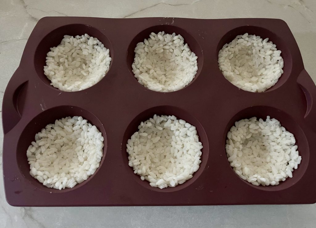 Na het koken heeft de rijst al het water opgenomen. Doe een ruime eetlepel terwijl het warm is in de muffin vormen. Het is ideaal om een siliconen muffinvorm te gebruiken omdat het siliconen het uit de vorm halen vergemakkelijkt; metalen vormen geven strakkere randen maar vereisen folie of moeten ingevet worden. Druk met de achterkant van de lepel om de rijst langs de randen te compacten, vorm een ‘mandje’ met een centrale holte voor de vulling. Hoe meer je aandrukt, hoe compacter het mandje zal zijn als het koud is. Om gelijkmatige randen te krijgen, gebruik natte handen of de achterkant van een theelepel.