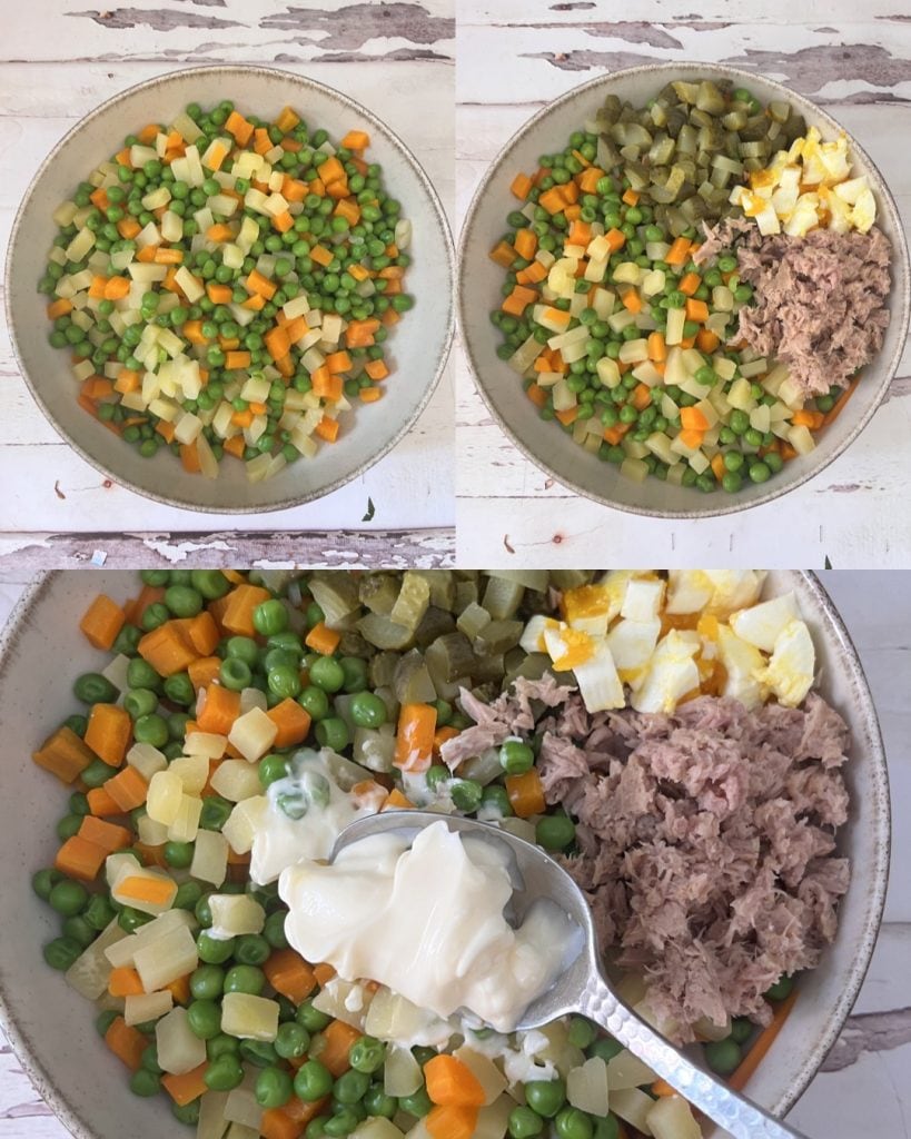 In een ruime bord, meng je de koude aardappelen, wortelen en erwten. Meng voorzichtig om de groenten niet te breken en voeg de augurken, eieren en verkruimelde tonijn toe.