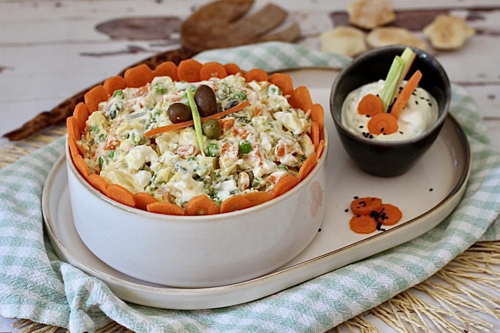 Deze versie van Russische salade is eenvoudig en snel omdat je voor de bereiding slechts één pan gebruikt waarin je alle ingrediënten kookt.