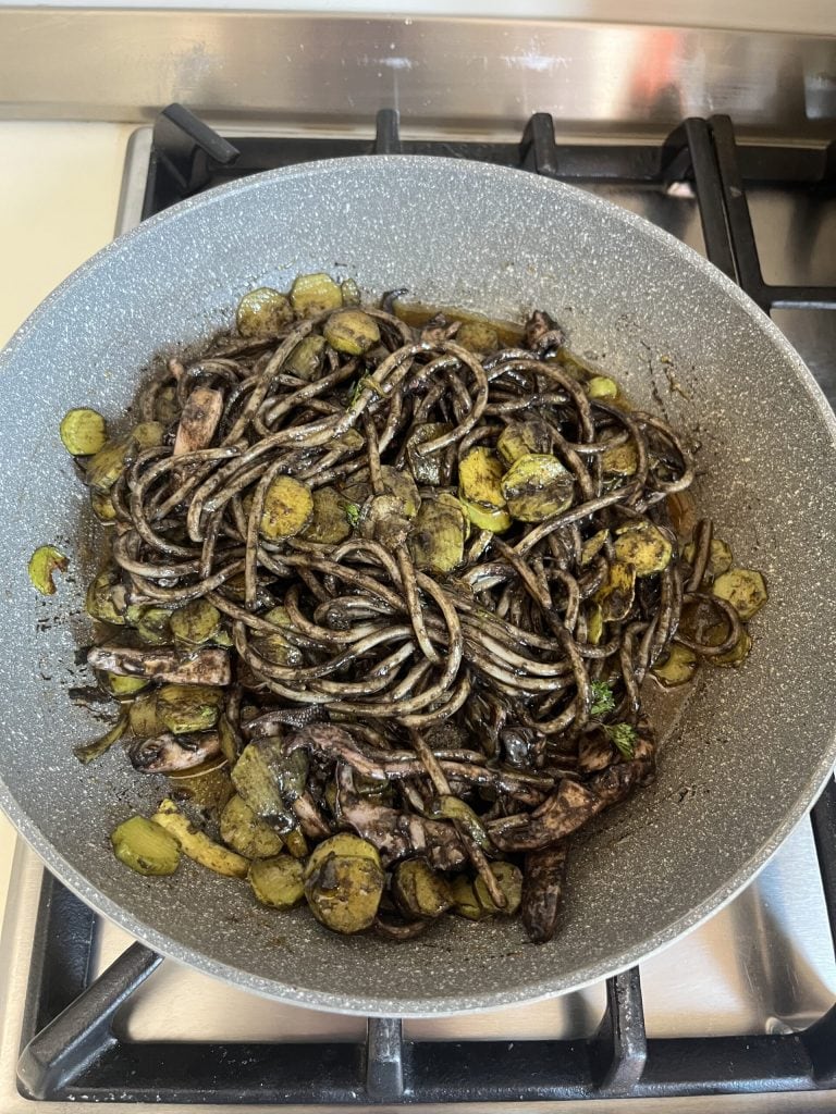 Voeg vervolgens onze inktvissen in plakjes toe en kook gedurende vijftien minuten. Na die tijd voegen we de trompetpompoenen, het zout en de inktvisinkt saus toe en koken nog 15 minuten. Ondertussen brengen we een pan met voldoende water aan de kook en koken onze spaghetti alla chitarra voor de tijd die op de verpakking staat en zouten. Na het koken gieten we de pasta af en