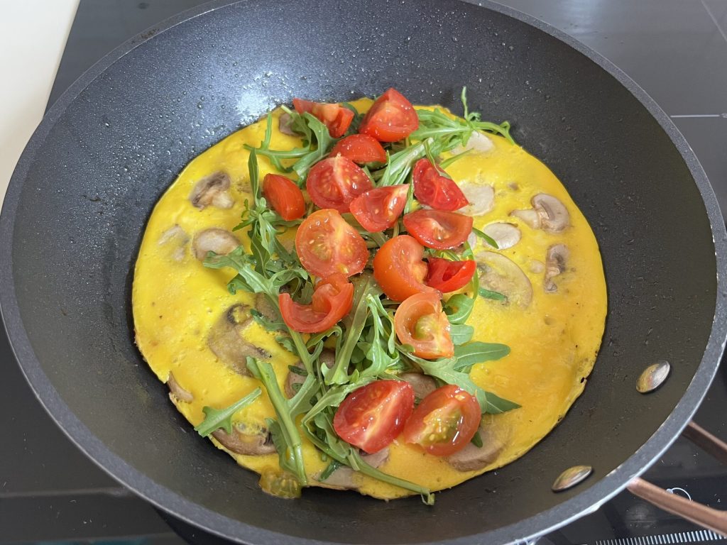 Overdrijf niet met de cherrytomaatjes: gebruik ze met mate om te voorkomen dat er te veel water in de omelet komt, waardoor deze zacht kan worden.