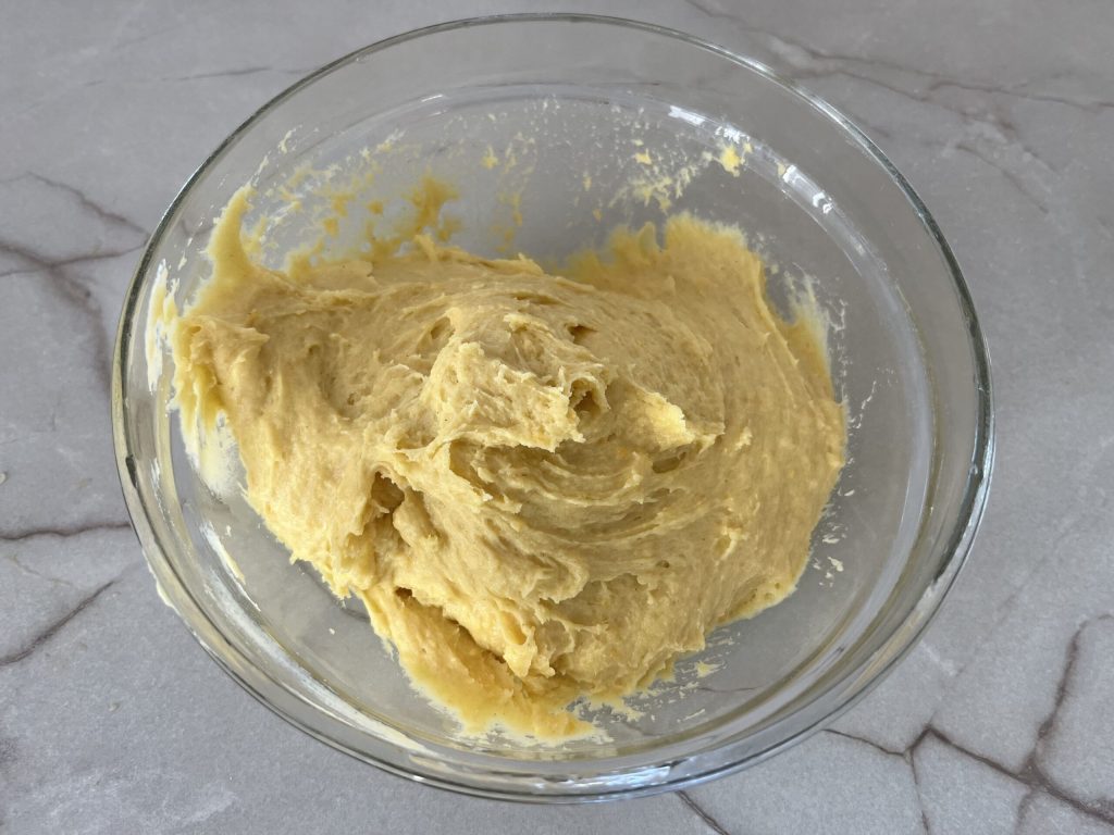 Voeg beetje bij beetje de bloem en het maïszetmeel toe, wat de koekjes knapperiger maakt, meng met een spatel van boven naar beneden tot je een homogeen mengsel krijgt. Het zanddeeg is nu klaar.