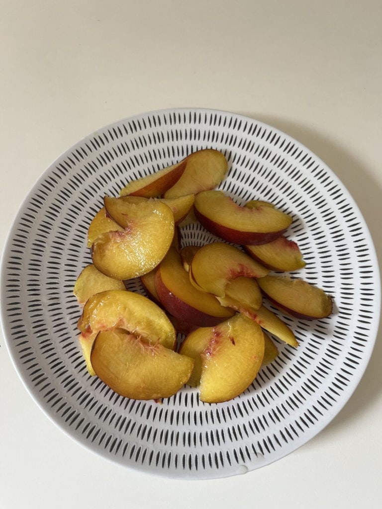 Om de heerlijke zomersalade te bereiden, beginnen we met het schoonmaken van het fruit en de groenten. Snijd de meloen doormidden en verwijder de zaden, was de perzik onder de kraan en verwijder de pit terwijl je de schil laat zitten en snijd de uiteinden van de courgette af.