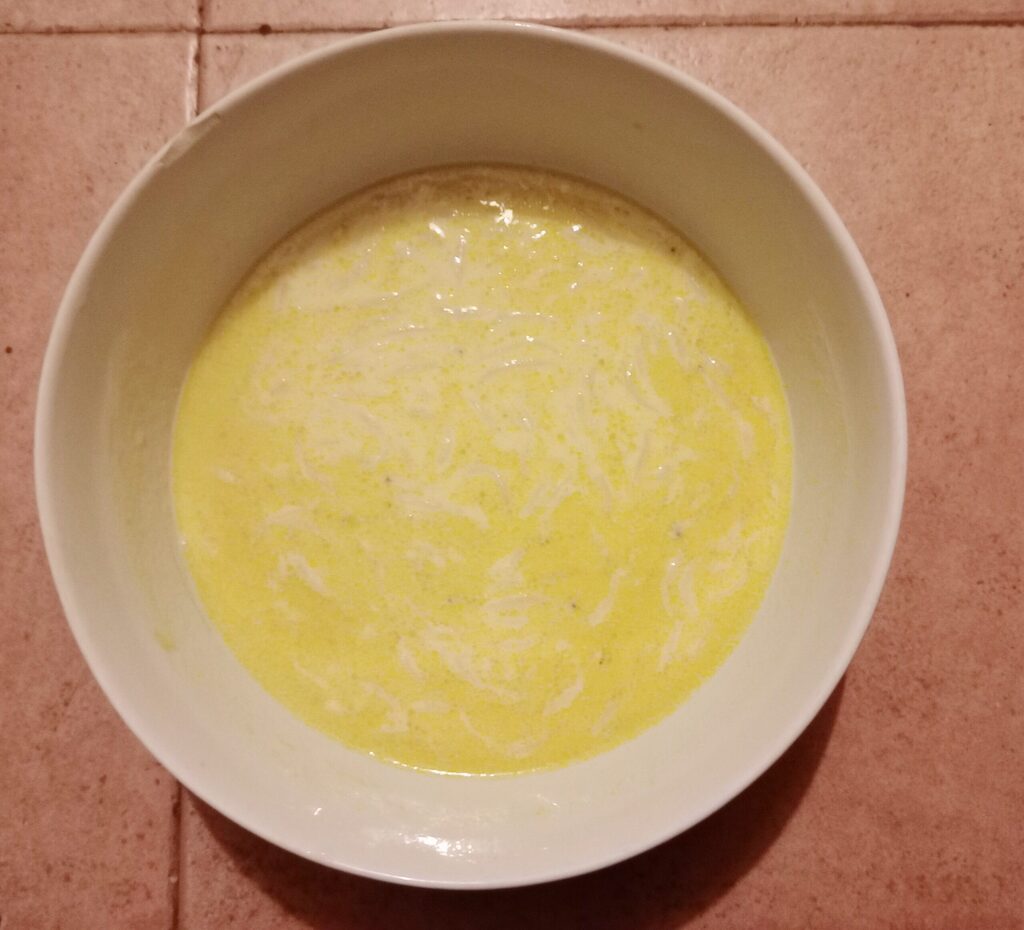 • Giet het koude water in een kom en voeg geleidelijk het meel toe. Roer goed met een lepel om eventuele klontjes te verwijderen.
