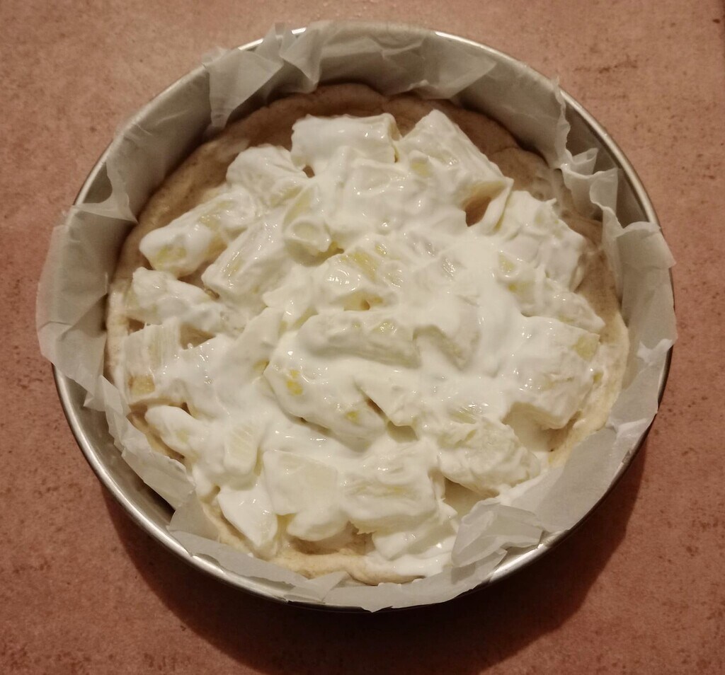 Rol het uit in de vorm bekleed met bakpapier, prik de bodem in met een vork, giet het romige mengsel erin en strijk het goed glad met een lepel.