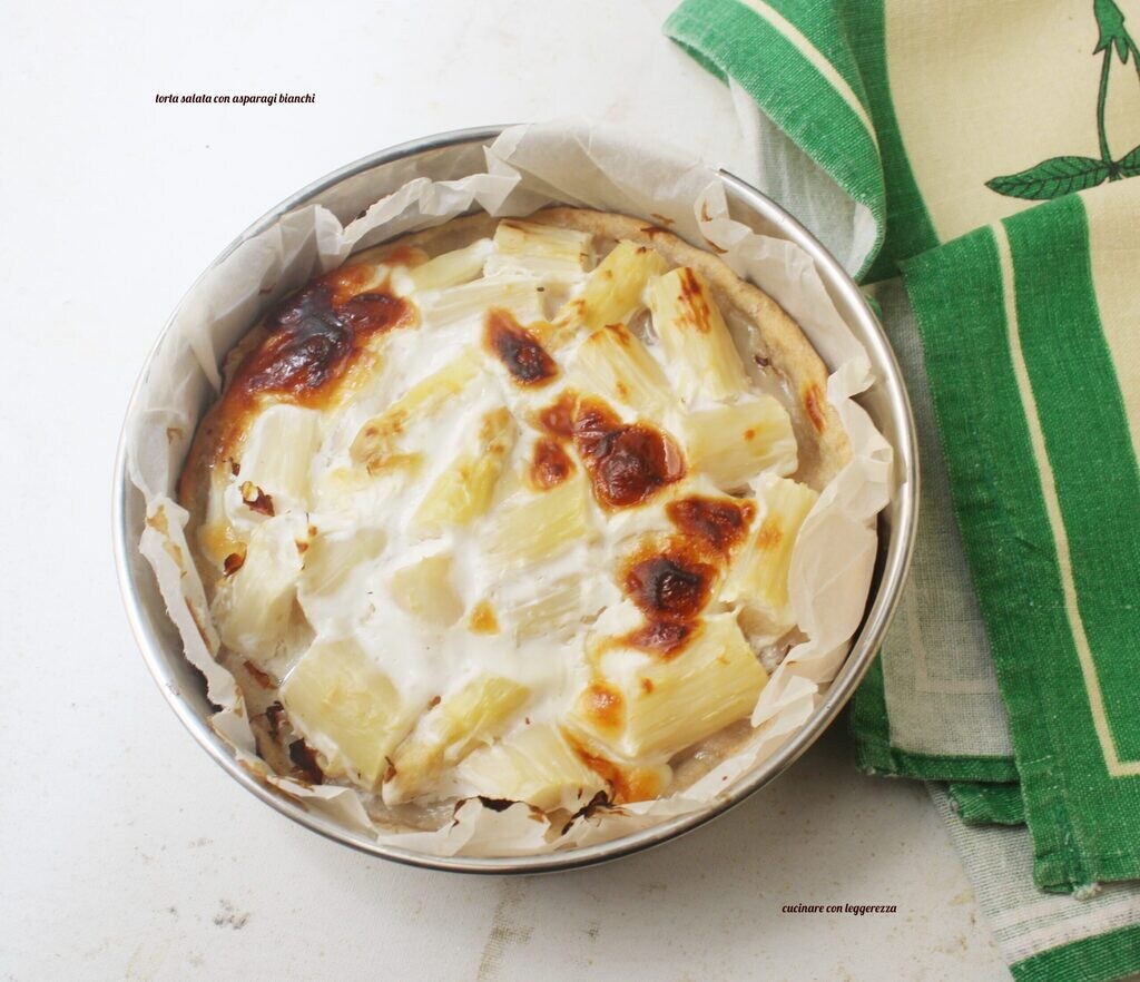 De hartige taart met witte asperges is gemaakt met een soort asperges die in deze periode te vinden zijn 🙂
