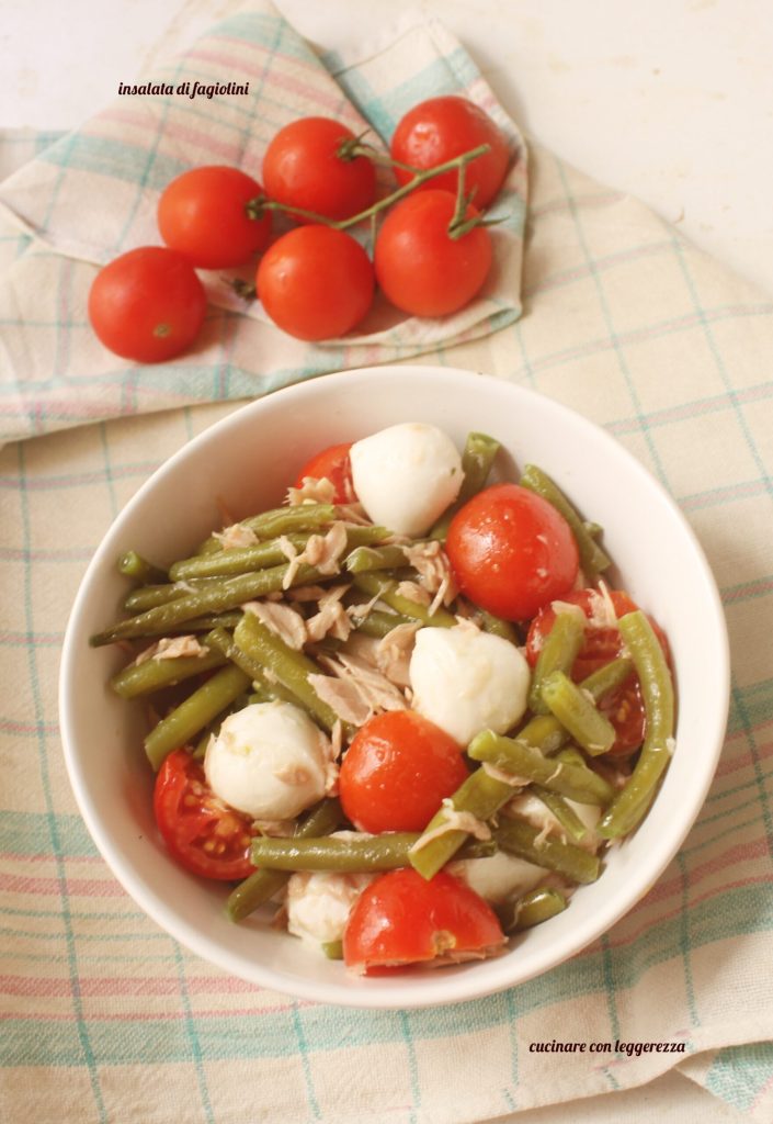 Ik had ook wat sperziebonen die ik de andere dag had gekocht en dacht een koude bijgerecht te maken met wat ik in huis had: cherrytomaatjes, tonijn en kleine mozzarella’s.