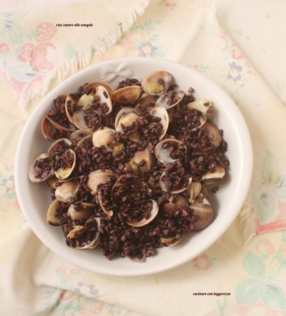 Zwarte rijst is een Italiaanse rijstsoort ontstaan door een kruising tussen een Aziatische en een soort uit de Povlakte. Het heeft veel voordelen voor ons lichaam: het is een krachtige antioxidant, bestrijdt vrije radicalen, verlaagt het slechte cholesterolgehalte, en voorkomt hartinfarct en kanker. Vergeleken met traditionele rijst is het rijker aan vitamines, vezels en is het minder calorierijk omdat het arm aan suikers is. Het is rijk aan mineralen, ijzer en heeft een hoge verteerbaarheid. Voor de lunch heb ik zwarte rijst met venusschelpen bereid: een compleet en tegelijkertijd licht hoofdgerecht.