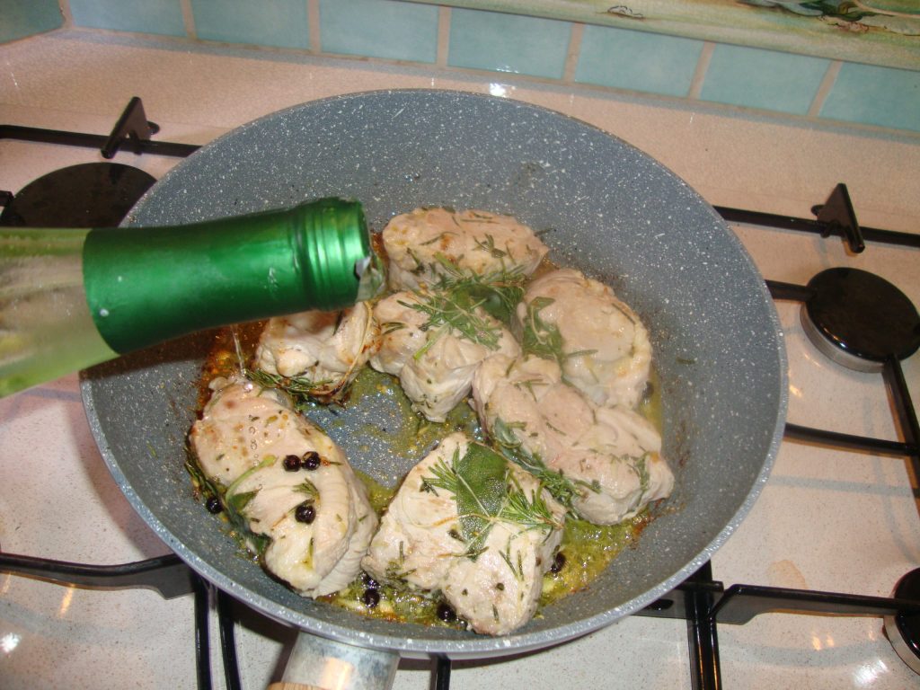 Blus af met de witte wijn en laat alle alcohol verdampen, terwijl je de haas blijft draaien.