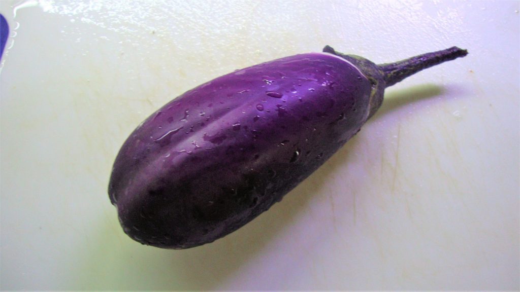 was de aubergines, verwijder de steel en snijd ze in plakjes van ongeveer 5 millimeter.