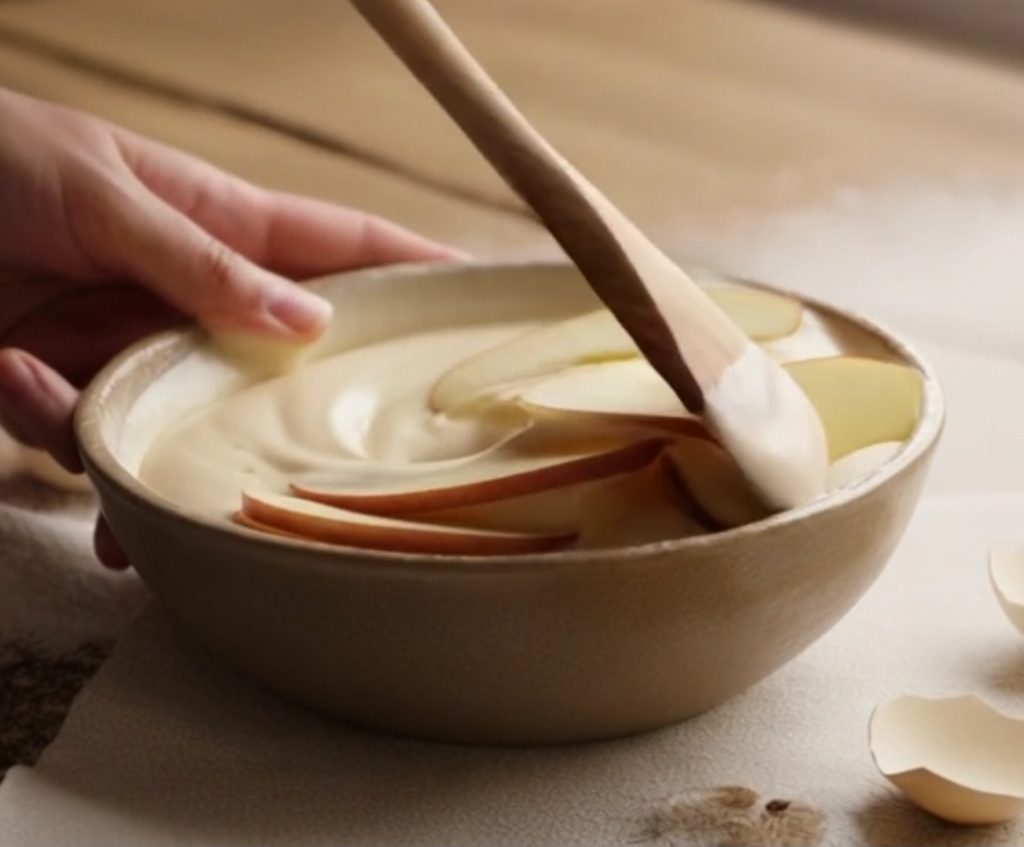 Voeg nu de helft van de appels toe en meng met een houten lepel.