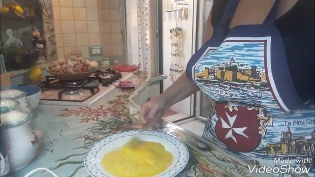Ondertussen, klop de eieren in een diep bord.