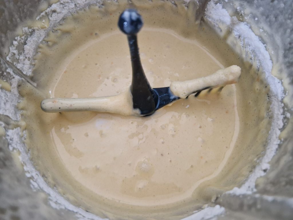 Voeg de warme melk beetje bij beetje aan het beslag toe en verwerk deze met zachte bewegingen.