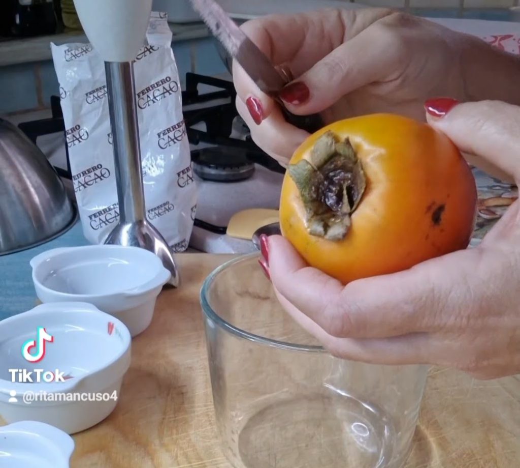 Snijd het in stukken en doe het in een kom. Als je kaki appels gebruikt, die harder zijn, voeg dan 2 eetlepels water toe per 150 g vrucht.