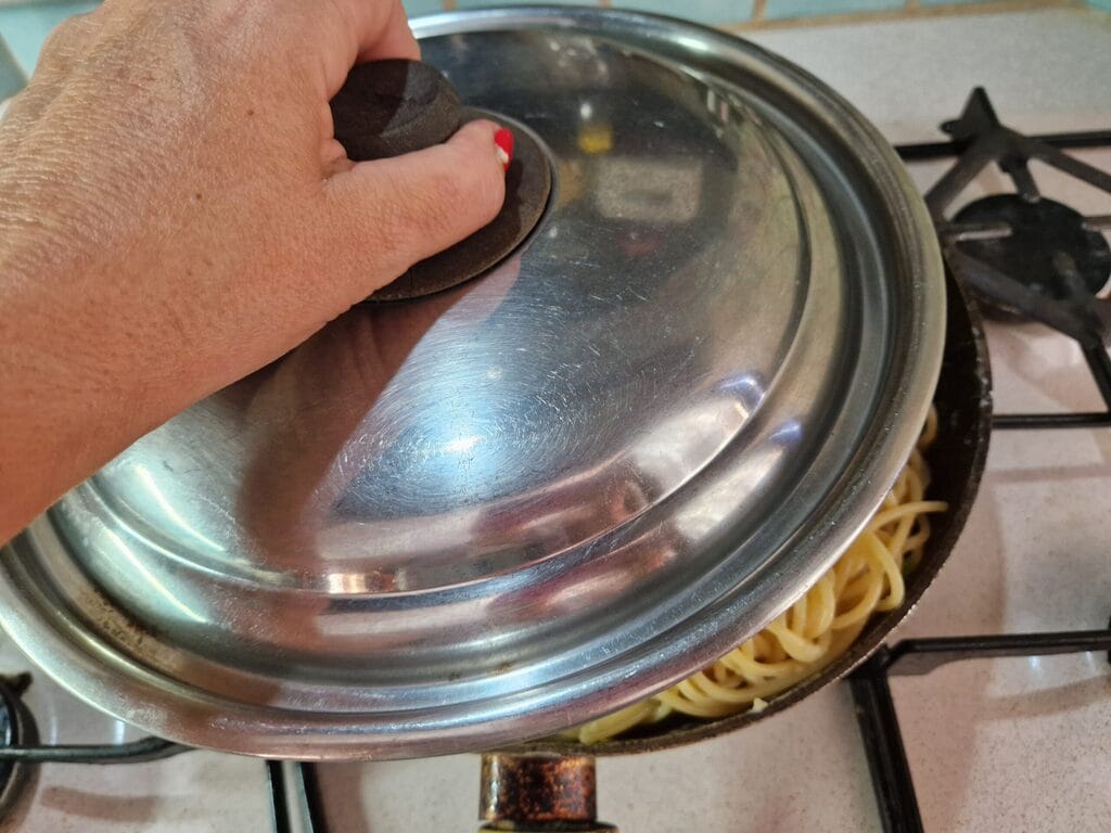 Dek af met een deksel, en blijf op een zeer laag vuur koken, anders brandt het onder, nog 3/4 minuten, leg het deksel erop en draai de frittata om, wees heel voorzichtig.