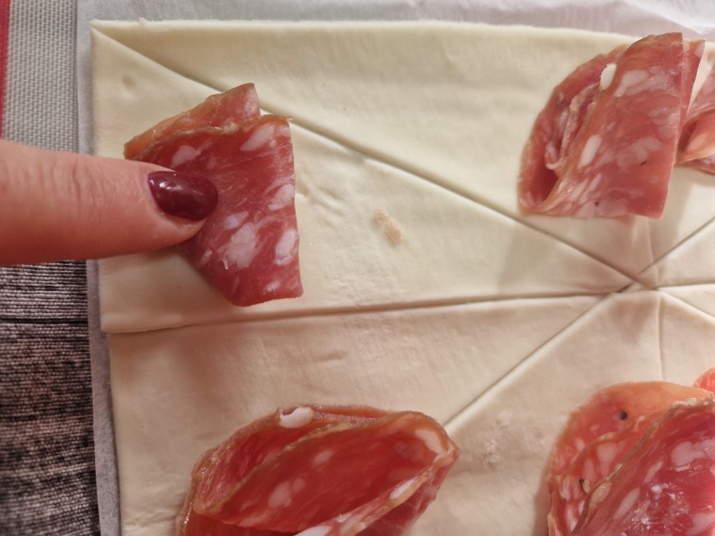 Voeg op dit punt een theelepel mortadellamousse toe aan de bladerdeegdriehoeken.