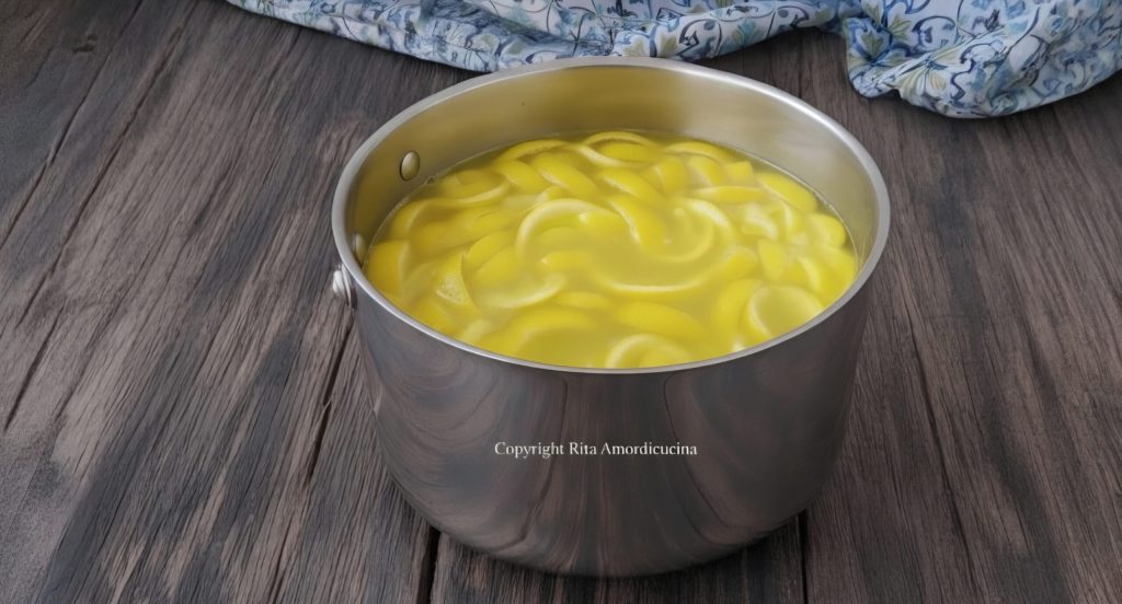 Giet de pure alcohol in een grote glazen pot of pan. met luchtdichte afsluiting en voeg de citroenschillen toe, die je een maand laat macereren op een donkere en koele plaats.