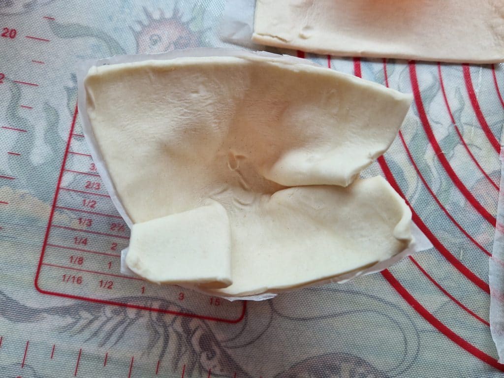 • Knip het bladerdeeg samen met het onderliggende bakpapier met een schaar