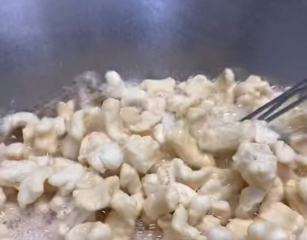 • Verwijder overtollige bloem en frituur in overvloedige zonnebloemolie, ongeveer 3/4, en de rest reuzel. De temperatuur moet behoorlijk heet zijn.