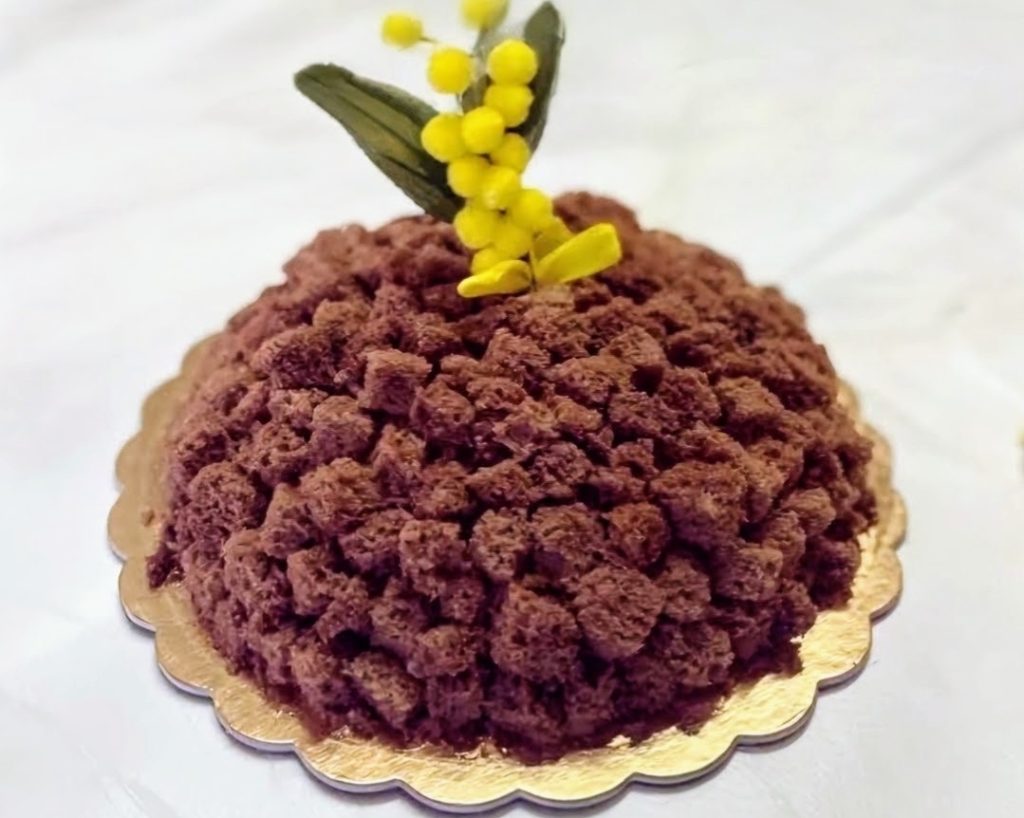 Ideaal voor zoetekauwen en voor degenen die een vleugje innovatie willen aan de klassieke mimosa. Ik heb het gecreëerd geïnspireerd door de klassieke mimosa taart, met een cacaobiscuit en diplomatieke room.